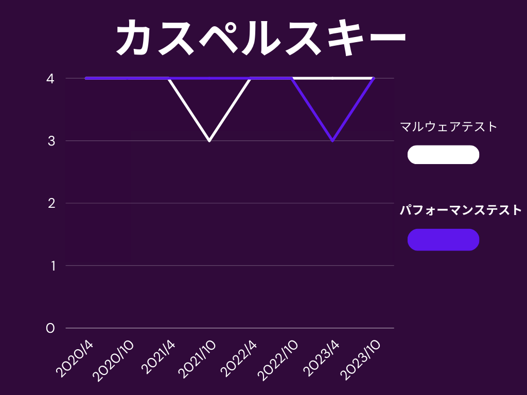 | カスペルスキー | 20/4 | 20/10 | 21/4 | 21/10 | 22/4 | 22/10 | 23/4 | 23/10 |