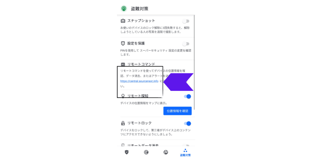 スマホの場合:自身のデバイスで「盗難対策」→「リモートコマンドのURL」を開きます。