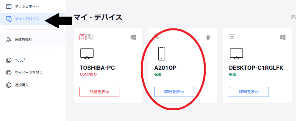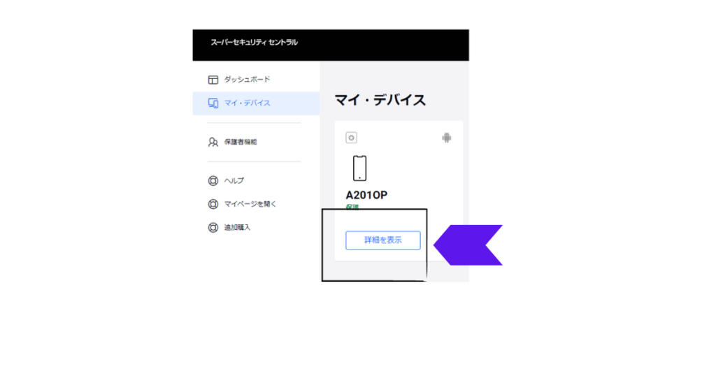 「セントラル」→「マイデバイス」→「検索したいスマホ」→「詳細を表示」まで進みます。