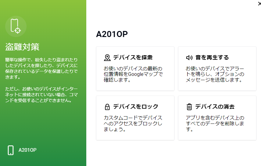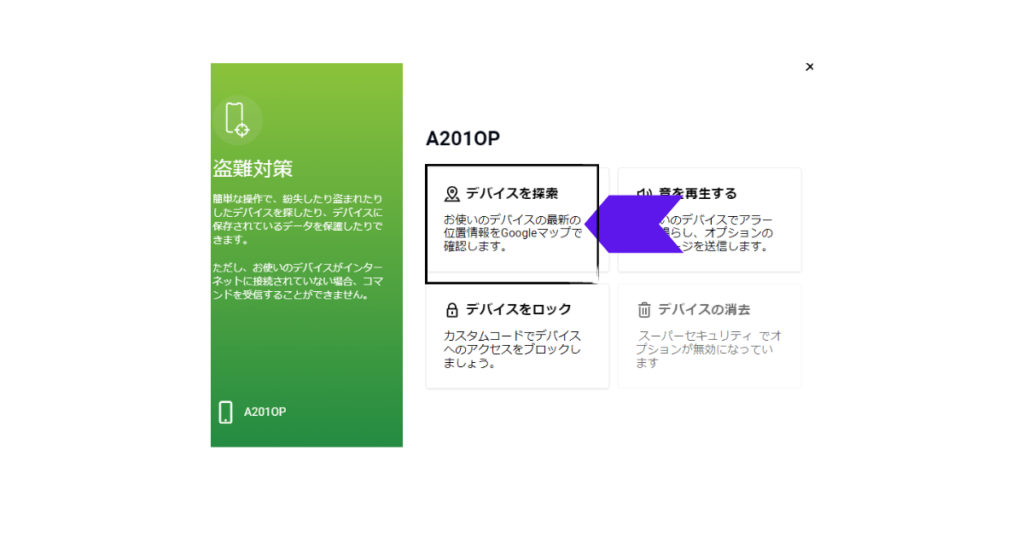 「デバイスを検索」でスマホを検索できます。
