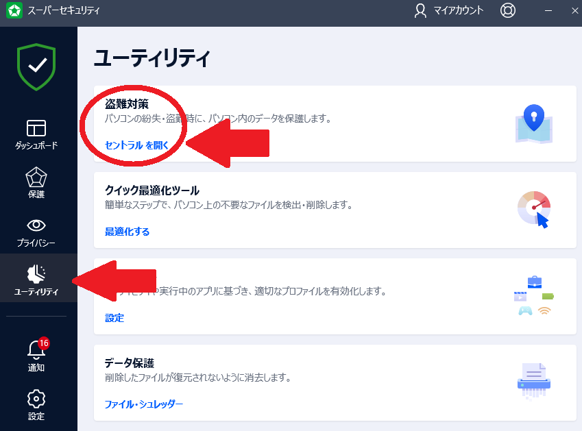 PCの場合:「メインパネル」→「ユーティリティ」→「盗難対策」→「セントラルを開く」