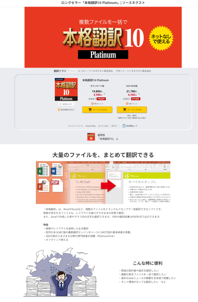 【5/20まで74%割引】ロングセラー「本格翻訳10 Platinum」| ソースネクスト