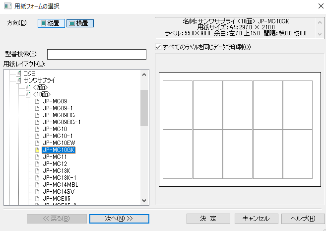 各会社から出されているラベルシートを登録済みなので、購入したシートを選ぶだけです。