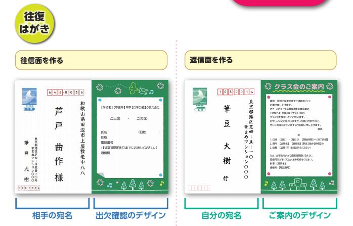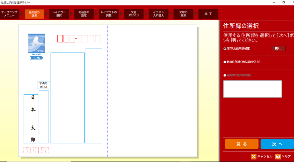 面倒な往復はがき設定もナレーションに沿って行えば、簡単に作れます。