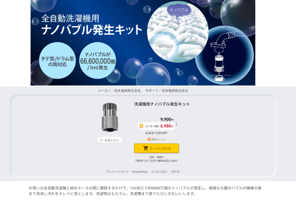 【29%OFF】洗濯機用ナノバブル発生器 - 大量バブルが繊維の奥まで洗浄
