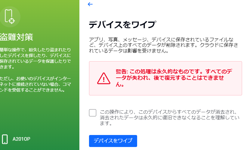 - リモートデータ消去:すべてのデータを消去して、工場出荷時に戻す
