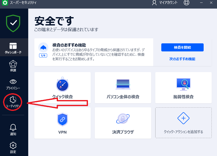 操作はスーパーセキュリティセントラルから行う。PCやスマホのスーパーセキュリティソフトからでも行える。