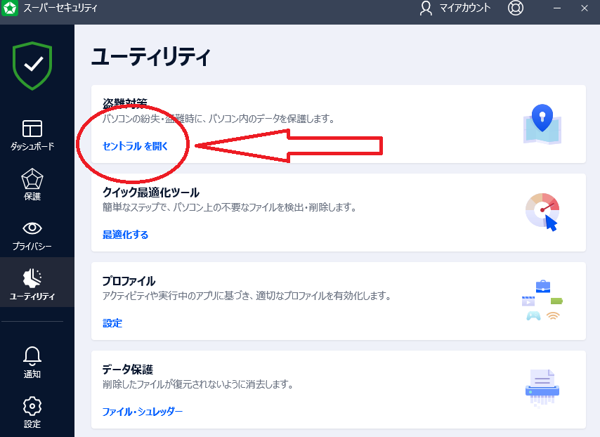 「スーパーセキュリティ」→「ユーティリティ」→「盗難対策(セントラルを開く)」