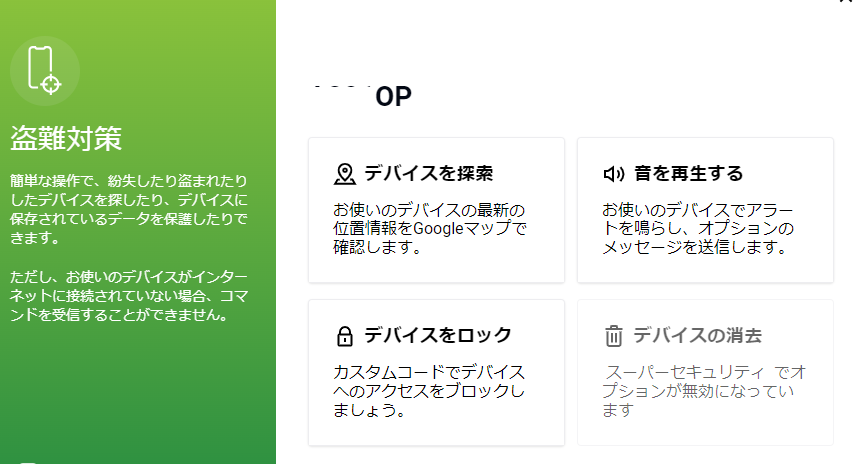 デバイスの「ZEROスーパーセキュリティ」→「一番右三つぽち」→「盗難対策」まで進む
