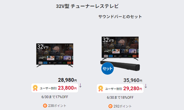 • Google TV搭載「32V型チューナーレステレビ」